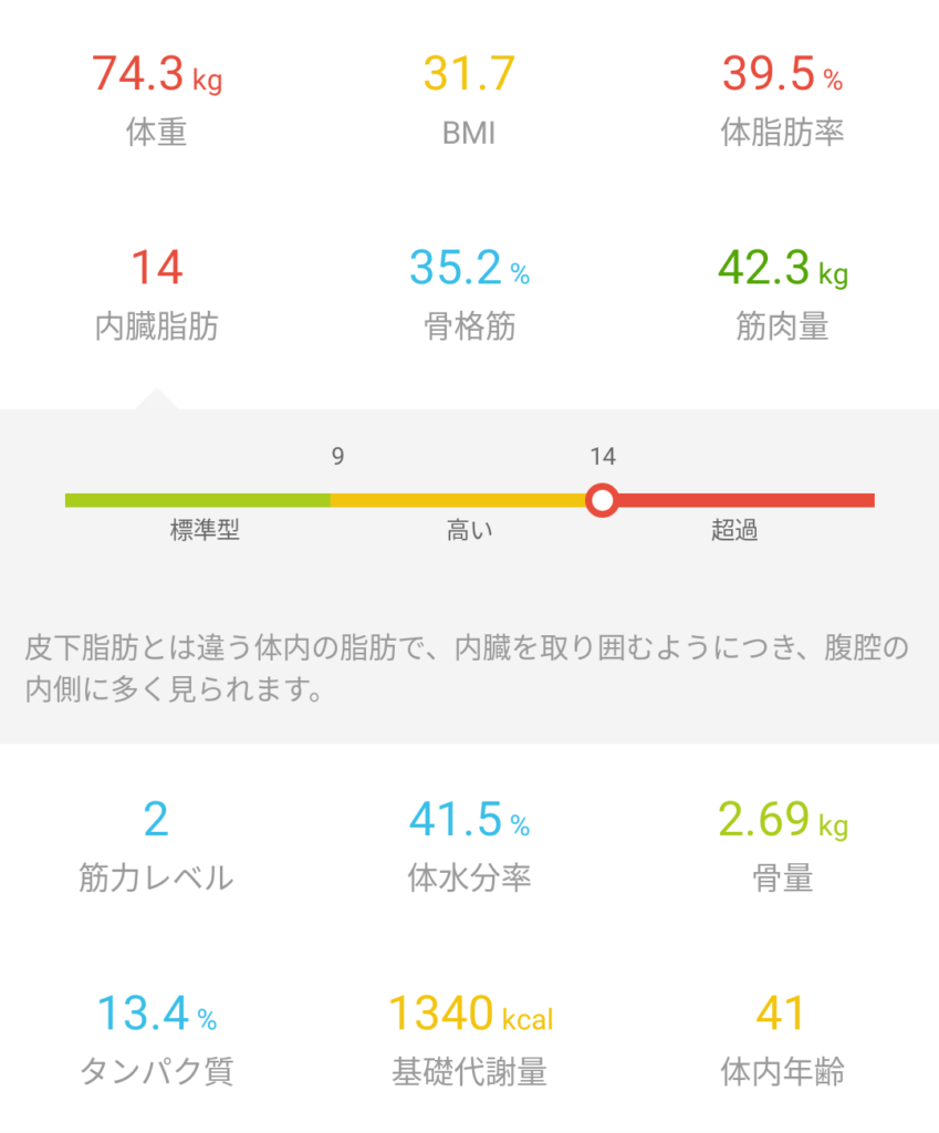 体組成計を使っての目標 私はスマホ(アプリ)と連携している体組成計を使用しているので、各種項目で標準値を目指すという小目標が結構モチベーション維持に役立ちました。ちなみに私が使用している体組成計は「Feelfit」というアプリを使用していて、正直精度は高くないですが各種項目の数値が見やすくて気に入ってます。